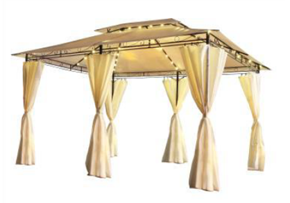 • on the contrary, the main features remain: the general shape of the pavilion, the double roof, the hanging curtains, the six posts; thus, the other features of the pavilion are more numerous, more visible, and more striking than the LED light‑point illumination.